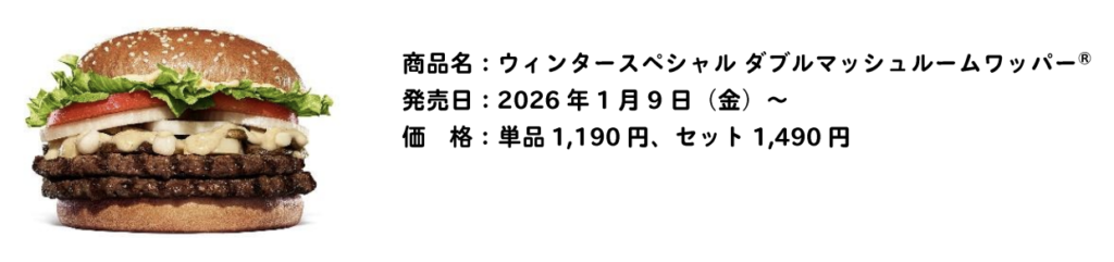 今回ご紹介するのは、バーガーキングから2026年1月9日に発売された新作、『ウィンタースペシャルマッシュルームワッパー』です 。
