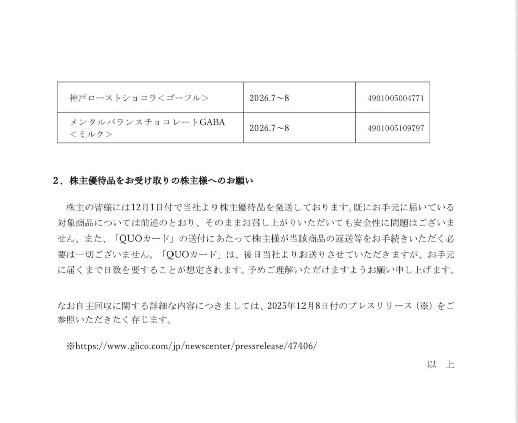 https://www.glico.com/assets/files/%E6%A0%AA%E4%B8%BB%E5%84%AA%E5%BE%85%E5%93%81%E3%81%A8%E3%81%97%E3%81%A6%E3%81%8A%E9%80%81%E3%82%8A%E3%81%97%E3%81%9F%E4%B8%80%E9%83%A8%E5%95%86%E5%93%81%E3%81%AB%E9%96%A2%E3%81%99%E3%82%8B%E3%81%8A%E8%A9%AB%E3%81%B3%E3%81%A8%E5%BD%93%E8%A9%B2%E5%95%86%E5%93%81%E7%9B%B8%E5%BD%93%E3%81%AE%E3%80%8CQUO%E3%82%AB%E3%83%BC%E3%83%89%E3%80%8D%E9%80%81%E4%BB%98%E3%81%AB%E3%81%A4%E3%81%84%E3%81%A6.pdf